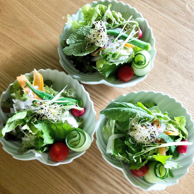 その他、2種類のレタス🥬、ニンジン🥕、かいわれ、タマネギ🧅、大葉、きゅうり、トマト🍅、ラデッシュなどのサラダです。