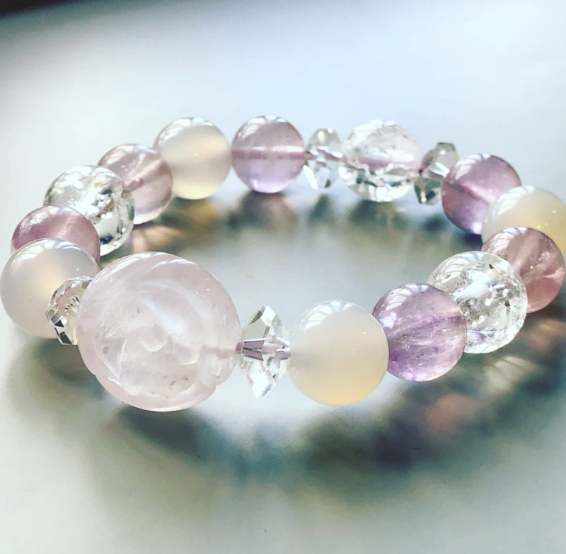 【バラ形ローズクォーツ×ホワイトカルセドニー×フローライト×クラック水晶×プレミアムカット水晶】