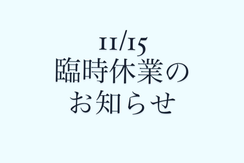 葬儀に参列の為、誠に勝手ながら11/15(水)は、臨時休業致します。