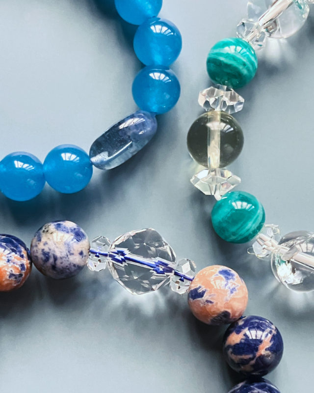 ブルージェード、ゼブラアマゾナイト、レッドラインソーダライトなどを使用。