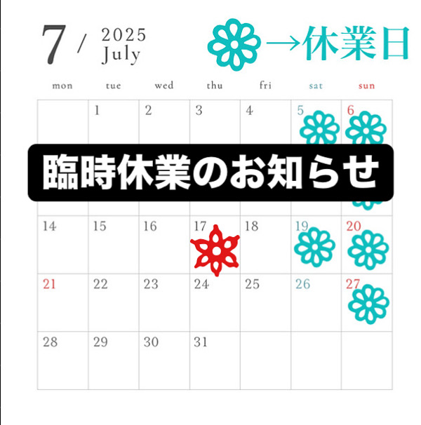 明日7/17(木)は、雑貨仕入の為、臨時休業致します。